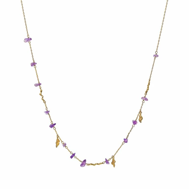Fin halskæde med ametyst sten fra Maanesten. Amatyst har en rensende og beroligende energi og er kendt for at have helende egenskaber, der beskytter mod negativ energi. Halskæden er produceret i genanvendt sterlingsølv (925) belagt med 18 karat guld og amatyst sten. Kædens længde er 410 mm og bredden på vedhæng er 20 mm.